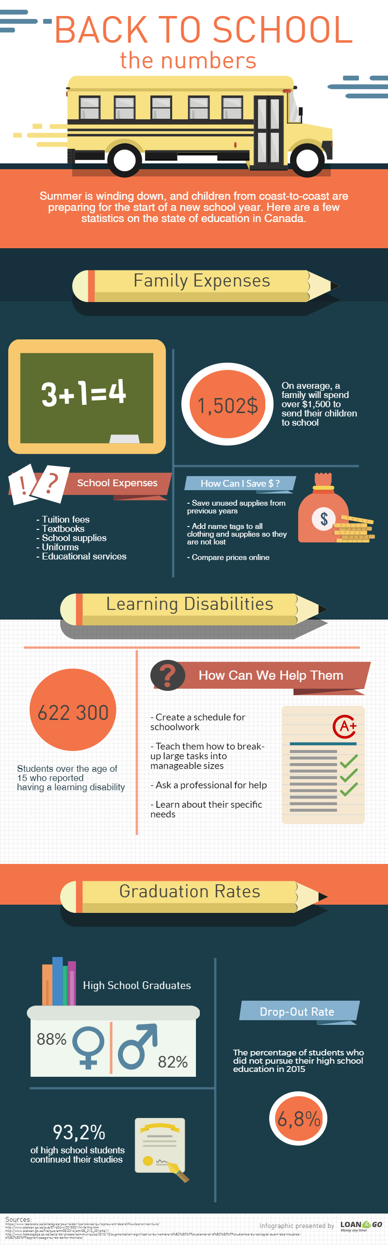School supplies are back in stock at most stores, days are starting to shorten, and you can feel the first hints of the brisk fall breeze in the wind. This can only mean one thing: It’s back-to-school time! How much do you know about the school system within Canada? Our newest infographic covers the basics of forming a back to school budget, as well as a breakdown of different statistics regarding the Canadian education system! Take a look below: